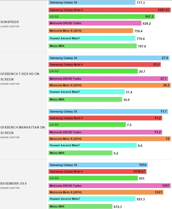 Motorola Droid Turbo в различных бенчмарках вместе с основными Android-конкурентами