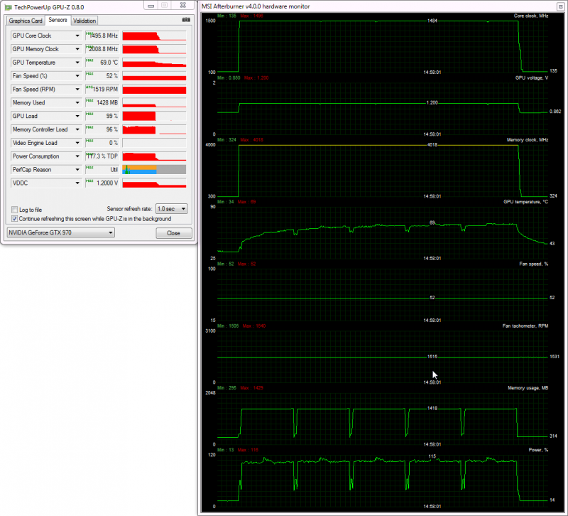 При этом, по данным мониторинга, максимальная частота графического процессора после разгона видеокарты достигала отметки 1496 МГц. То есть можно сказать, что практически все оригинальные GeForce GTX 970 берут полуторагигагерцевый рубеж частоты графического процессора.