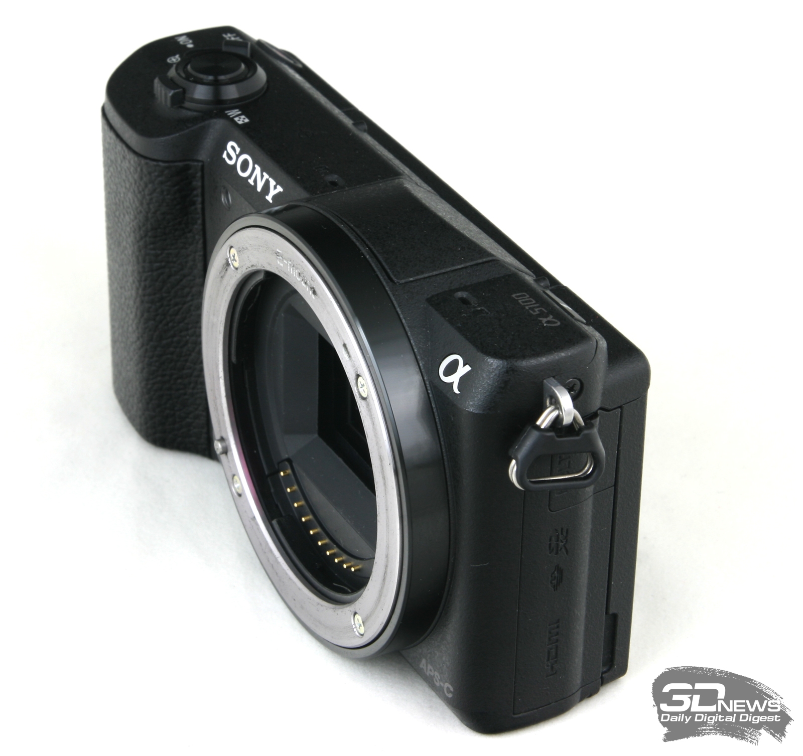 Спереди находятся лишь байонет и лампа подсветки автофокуса, которая также является индикатором таймера автоматического спуска затвора. У ILCE-6000 здесь был еще ИК-порт, но новинка его лишена.