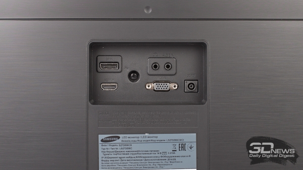 В центре задней панели собраны все видеовходы Samsung S27D590CS. Их немного: DisplayPort, HDMI и D-Sub, — конечно, здесь не хватает разъёма DVI-D, но и такого набора портов хватит на все случаи жизни. Для ввода и вывода звука у дисплея есть два 3,5-мм аудиоразъёма, расположенные рядом с видеовходами.