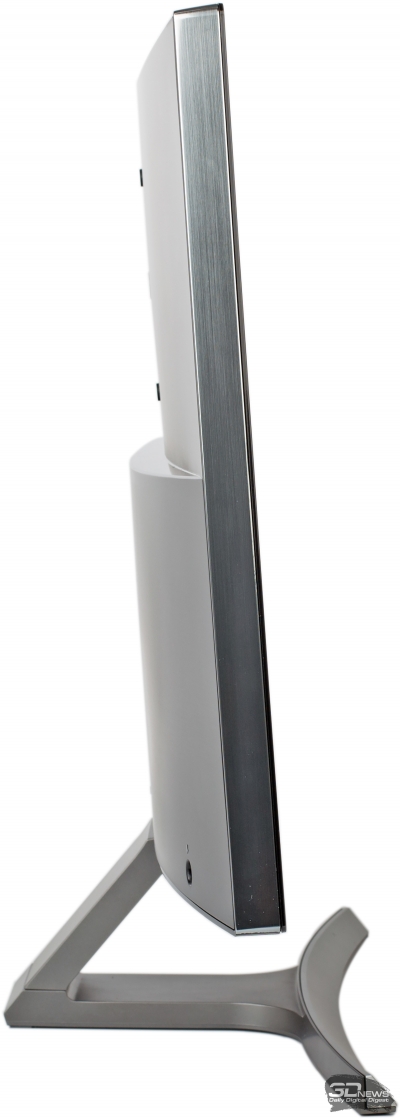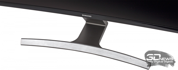 Подставка у монитора довольно простая — она изогнутая и съёмная. Вот только крепится она к герою нашей статьи лишь за счёт сил трения и тяжести. Поэтому попытка перенести монитор с одного стола на другой, если взять его за подставку и наклонить экраном вниз, может закончиться весьма печально. Увы, в Samsung S27D590CS, как и во многих мониторах корейской компании, реализована именно такая система крепления подставки.