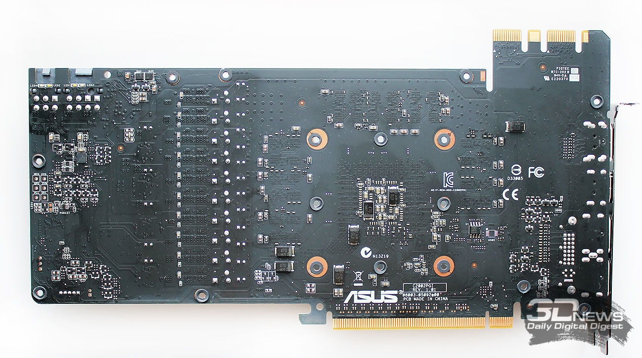 Печатная плата видеокарты во многом напоминает плату ASUS GeForce GTX 780 Ti DirectCU II OC. Силовая часть расположена на стандартном для топовых графических карт месте, а микросхемы памяти распаяны только на лицевой стороне вокруг графического процессора.