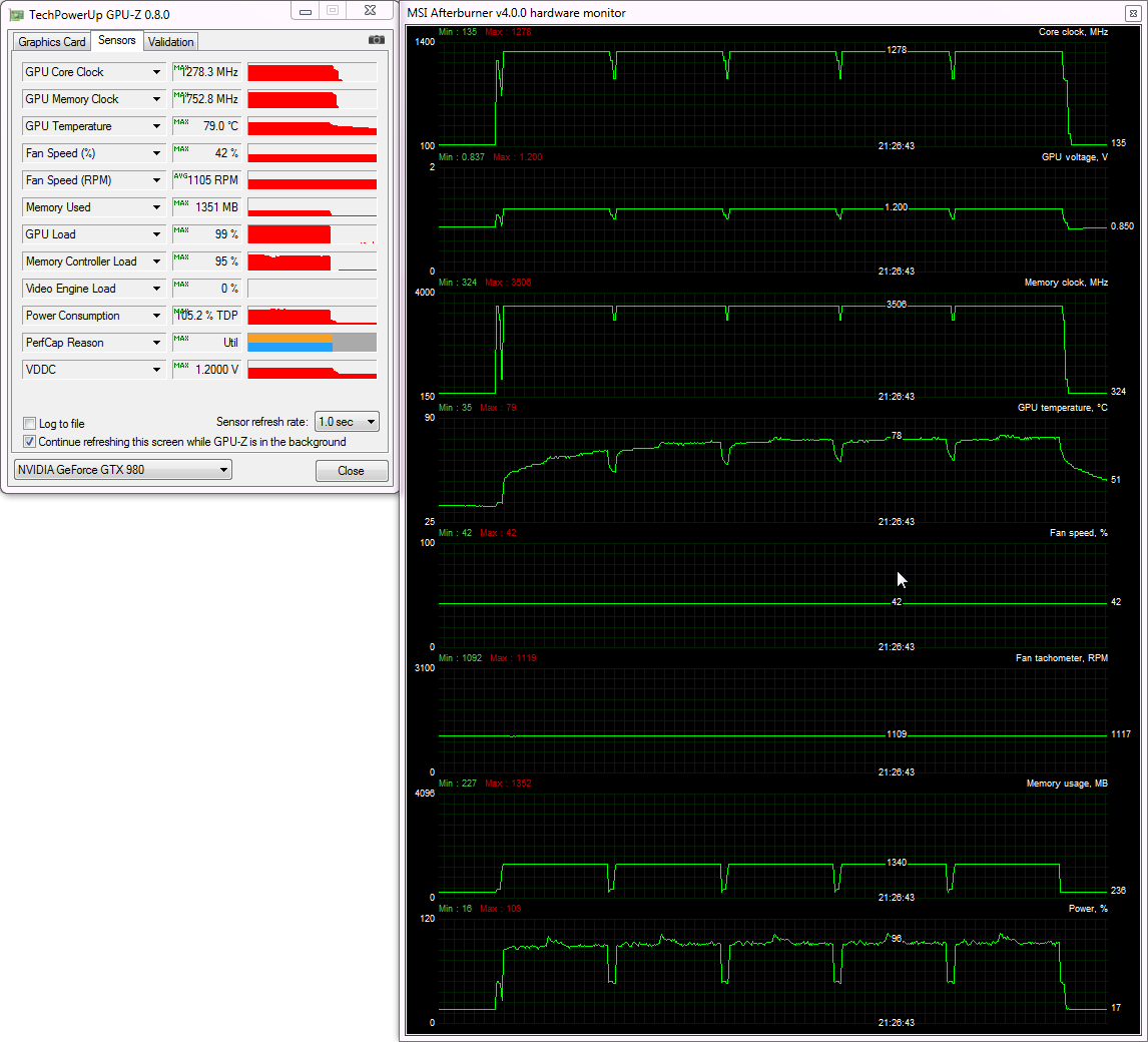 Для мониторинга температур и всех прочих параметров применялись программа MSI Afterburner версии 4.0.0 и утилита GPU-Z версии 0.8.0. Все тесты проводились в закрытом корпусе системного блока, конфигурацию которого вы сможете увидеть в следующем разделе статьи, при средней комнатной температуре 24,0 градуса Цельсия.