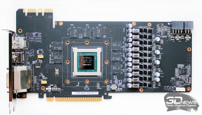 Система питания графического процессора восьмифазная, а ещё две фазы отведены на питание памяти и самих силовых цепей.