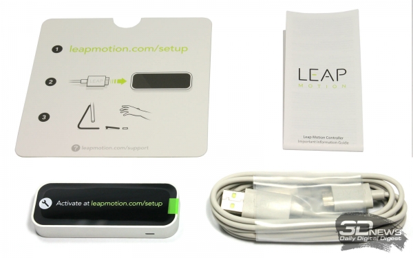 Контроллер поставляется в компактной, ничем особо не примечательной картонной коробке светлых оттенков. Мимо такой коробки легко пройти и не заметить, что перед вами только что промелькнуло уникальное устройство с технологиями будущего. Внутри, кроме самого модуля, были найдены лишь два кабеля с разъёмами microUSB 3.0 разной длины и краткое печатное руководство по началу работы.