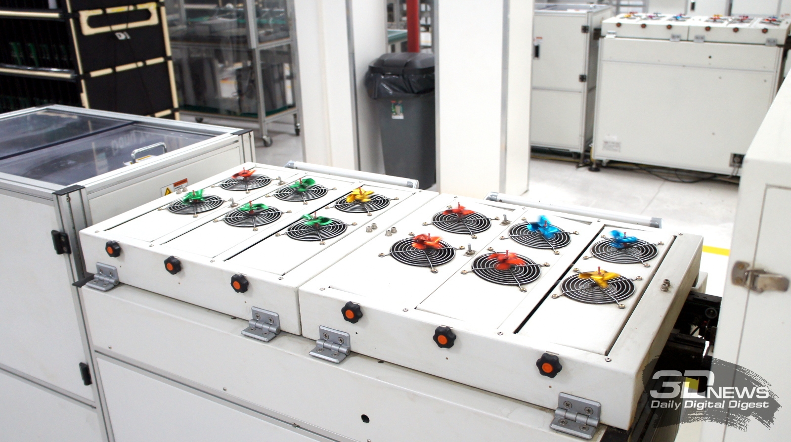 Ещё одна проверка — и заготовки отправляются в длинную печь, где они равномерно и постепенно нагреваются и остывают. Снова проверка — и можно переходить к заключительному этапу: заливке ПО и тестированию работоспособности платы. Делается это тоже автоматически. Раньше надо было вручную подключать все кабели и карты, а теперь хитрая машинка сама втыкает всё, что нужно, и обслуживает четыре платы за раз. Вообще, в этом цеху людей совсем немного. Периодически надо заправлять ленты в монтажные машины да проводить визуальный контроль корректности монтажа — компьютеры ещё не научились делать это так же быстро и качественно, как люди. Готовые платы в очередной раз выборочно проверяются и отправляются на небольшой склад, откуда они попадут на первый этаж — прямо в руки работников конвейера по сборке дисплеев.