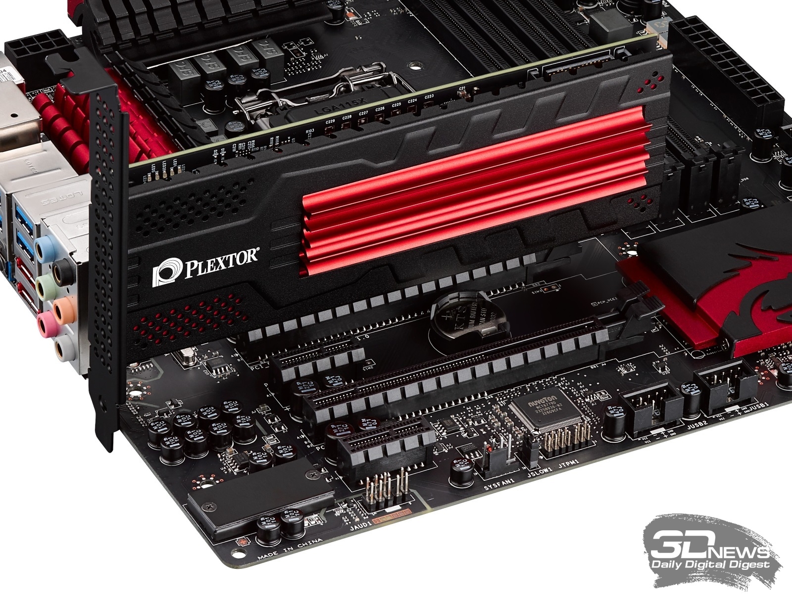 Как видите, визуально роднит новинку с M6e разве что размер, то есть форм-фактор HHHL (Half-Height, Half-Length). Внешний же вид поменялся кардинально. Печатная плата получила модный чёрный матовый текстолит. А с лицевой стороны весь накопитель спрятался под фигурным чёрным алюминиевым кожухом, в центре которого врезан красный радиатор, который должен отводить тепло от контроллера и чипов памяти. Расчёт дизайнеров понятен: подобное цветовое решение часто применяется в различном игровом железе, поэтому Plextor M6e Black Edition будет гармонично смотреться рядом со многими геймерскими материнскими платами и видеокартами большинства ведущих производителей.