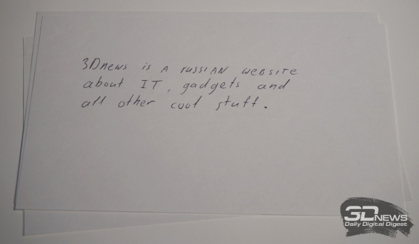 Второй вариант — распознавание рукописного ввода. На стенде предлагалось просто написать на листке бумаги какую-нибудь фразу — и навести на него камеру планшета с Zeroth на борту. Точность распознавания пока далеко не идеальная, но вполне приличная — кривой почерк автора этого материала иногда не способны прочитать даже люди, а планшет верно распознал большую часть слов. Правда, в глаза бросается то, насколько много аспектов надо предусмотреть, чтобы программа работала гладко и стабильно. Например, справиться с отдельным словом, написанным крупным шрифтом, не смогла — ее учили, что люди обычно пишут на листе как минимум несколько строк текста.