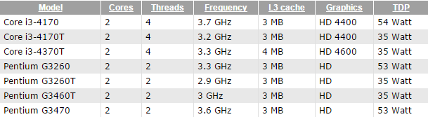 Под брендом Pentium будут выпущены модели G3260, G3260T, G3460T и G3470, а линейка Core i3 пополнится чипами i3-4170, i3-4170T и i3-4370T. Все они получат на 100 МГц увеличенную частоту относительно текущих моделей — G3250, G3250T, G3450T, G3460, i3-4160, i3-4160T и i3-4360T. Новые процессоры будут двухъядерными; впрочем, Core i3 будут располагать поддержкой Hyper-Threading. Большинство чипов будет располагать 3 мегабайтами кеша L3 и лишь Core i3-4370T получит 4 мегабайта.
