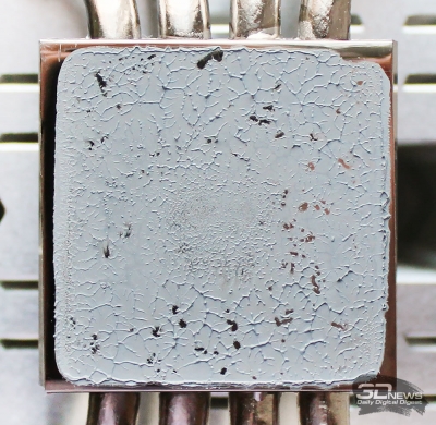 В плане ровности этой поверхности у Thermalright перманентно были «технологические особенности» — проще говоря, она стабильно оказывается выпуклой. Вот и наш сегодняшний экземпляр кулера имеет такую выпуклость, правда совсем незначительную, поэтому она практически не сказалась на полученном отпечатке.