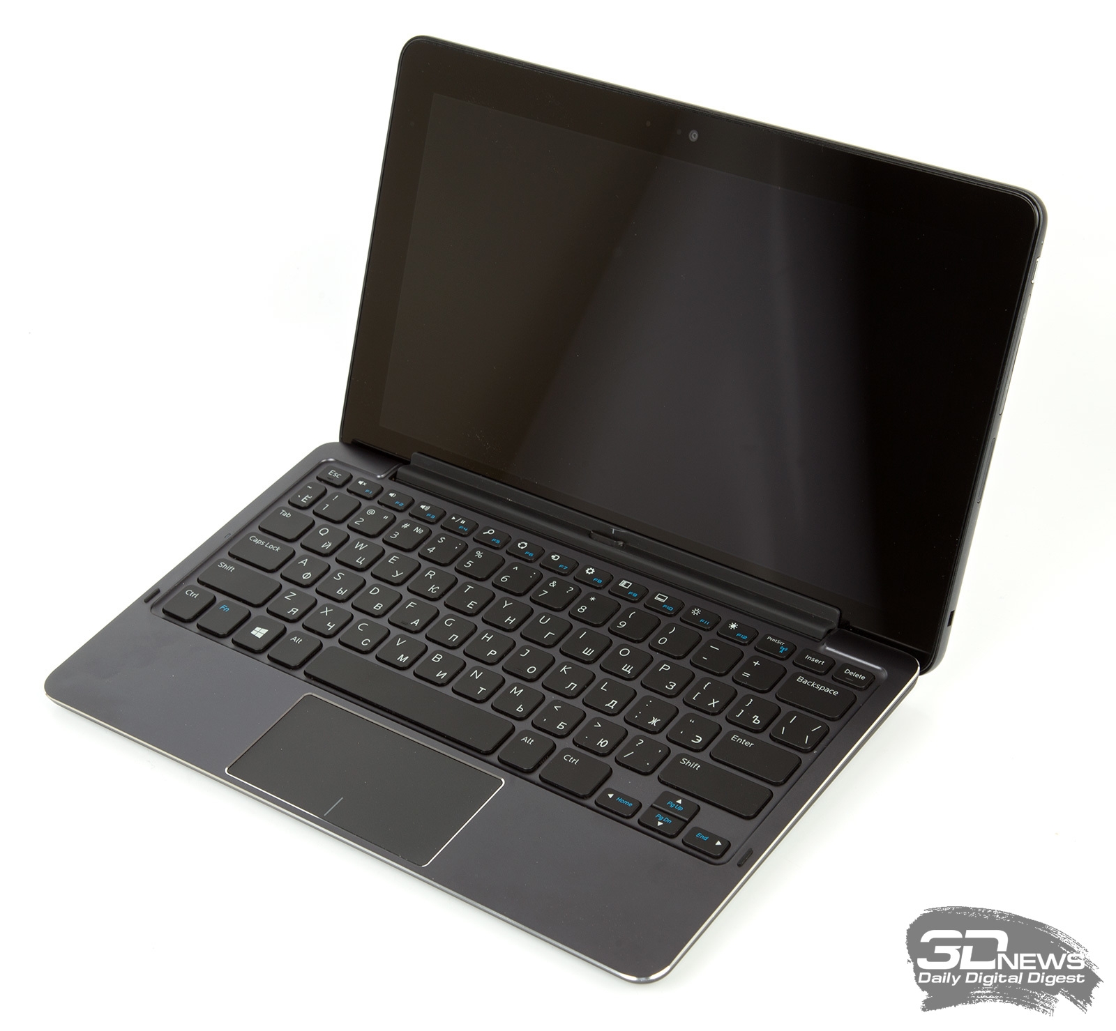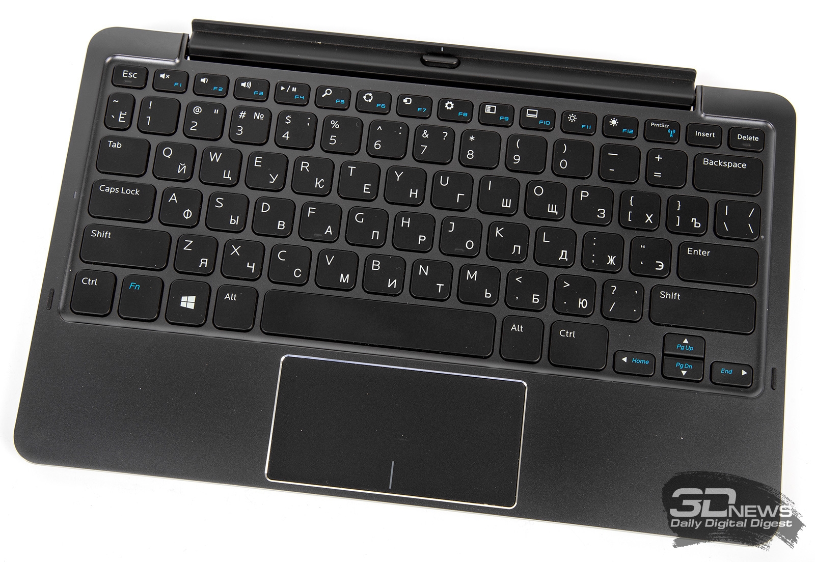 В нашу тестовую лабораторию попала версия Dell Venue 11 Pro с металлической отстёгивающейся клавиатурой, внутри которой установлен дополнительный аккумулятор. Ход кнопок у неё вполне обычный, а вот размер клавиш небольшой – к ним придётся привыкать. Размеры тачпада составляют 90 × 50 мм, нажатие «правой кнопки» обрабатывается без проблем, но жесты работают далеко не с первого раза.