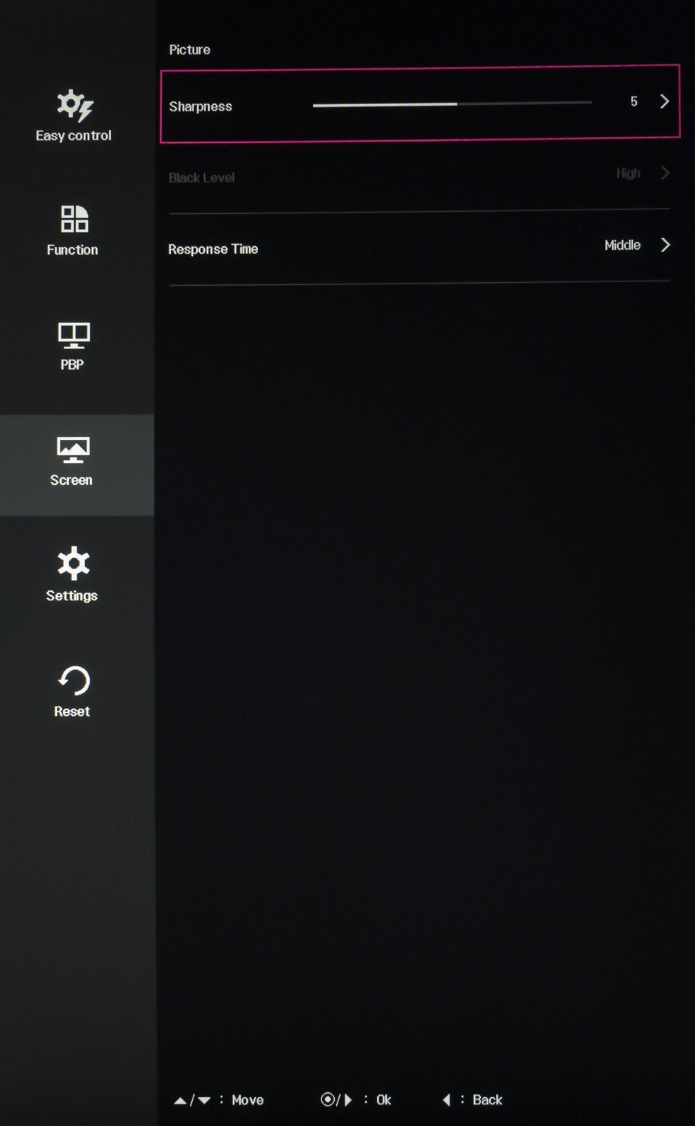 Основное меню всегда находится в правой части экрана, во всю его высоту. Оно строгое и мрачное, преобладает чёрный цвет. В первом разделе, Easy Control, находятся настройки яркости, контрастности, громкости встроенной акустики, выбор источника сигнала и режима работы встроенного скалера изображения.