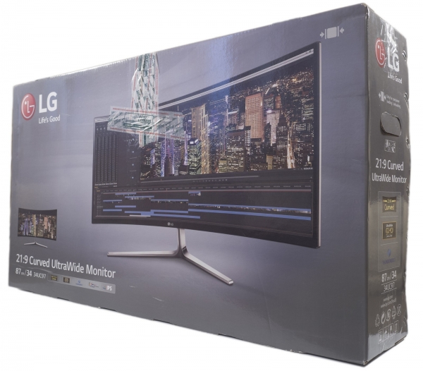 Монитор LG 34UC97-S поставляется в коробке серо-чёрной гаммы с качественной полиграфией. Размеры упаковки, несмотря на изогнутость экрана, идентичны таковым у модели 34UM95-P. Пластиковая ручка для переноски отсутствует — вместо неё есть два специальных выреза с обоих торцов.