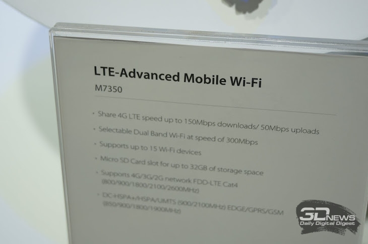 Мобильный беспроводной маршрутизатор TP-LINK M7350 поддерживает сети 4G LTE (cкорость входящего трафика до 150 Мбит/с, исходящего — до 50 Мбит/с) с передачей данных в двух диапазонах: 2,4 ГГц и 5 ГГц. Образец такого маршрутизатора в ближайшем будущем окажется в нашей тестовой лаборатории.