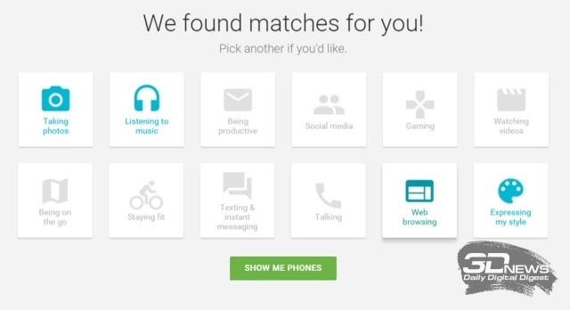 Новый сервис, получивший незамысловатое название «Which Phone», представляет собой короткий блиц-опрос для определения ключевых требований, предъявляемых к смартфону. Стоит сразу отметить, что среди вопросов вы не найдёте упоминаний о количестве ядер, мегапикселях, объёме ОЗУ и других технических нюансах, которые могут поставить в тупик не слишком хорошо подкованного в информационном плане пользователя. Опрос основан на выборе простых и понятных предпочтений, подытожив которые системы сможет сгенерировать три наиболее подходящих варианта.