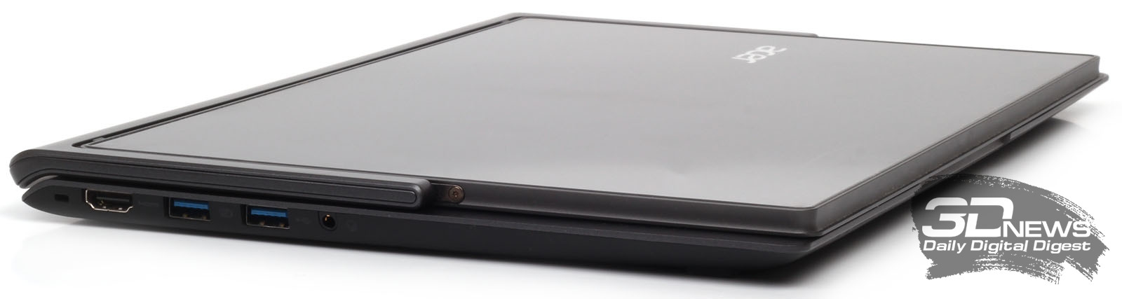 Поворотный механизм имеет собственное фирменное наименование – Ezel Aero Hinge, но чем-то революционным не является. Дело в том, что ещё пару лет назад в нашей тестовой лаборатории уже побывал другой представитель трансформеров Acer с аналогичной, хотя и менее изящной схемой изменяемой геометрии. Речь идёт о модели Acer Aspire R7, название которой и породило путаницу в модификациях уже новой модели Acer Aspire R13. Но то был большой, 15,6-дюймовый ноутбук с толщиной корпуса 28,5 мм. Наш подопытный куда скромнее по своим габаритам.