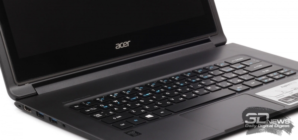 Клавиатура у Acer Aspire R13, если так можно выразиться, традиционная для ультрабуков Acer. Плоские клавиши размером 16 × 14 мм имеют минимально возможную высоту и достаточно большое пространство между собой (не менее 3 мм), что позволяет не промахиваться мимо нужной клавиши при слепой печати. Другой вопрос – раскладка. К ней у нас возникло (да и раньше возникало) немало вопросов и претензий. Несмотря на огромную ничем не занятую площадь вокруг клавиатуры, производитель решил сэкономить и совместил не только ряд функциональных клавиш с рядом цифр, но ещё и клавиши [Pause], [Prt Scr], [Insert], [Home] и [End] с другими клавишами. Также непривычно расположены и имеют необычные форму и размеры клавиши [Delete], [PgUp], [PgDn], [Caps Lock] и буква [Ё]. Назвать клавиатуру Acer Aspire R13 удобной, увы, нельзя, так как к ней придётся долгое время привыкать. Если вам приходится набирать много текста, перед покупкой лучше внимательно ознакомиться с раскладкой и подумать, а сможете ли вы адаптироваться к ней.