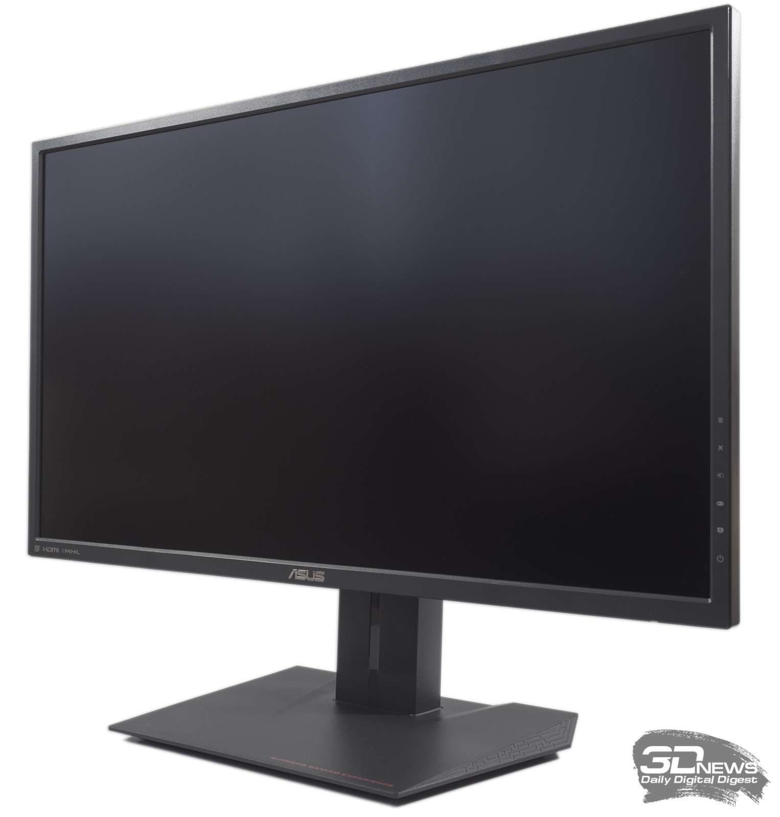 В мониторе используется качественный темно-серый матовый пластик с различной фактурой (в зависимости от элемента). По бокам фигурной и слегка наклонённой подставки с помощью гравировки нанесён своеобразный рисунок, а спереди красуется надпись Supreme Gaming Experience.