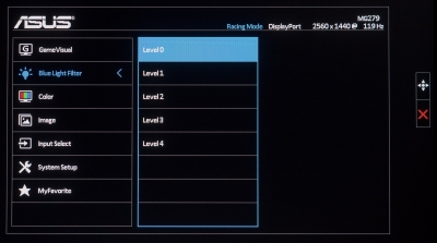 Дизайн меню давно не претерпевает изменений. Он прост, лаконичен и современен. В случае с новинкой в нём содержится семь разделов. Первый из них поменял название со Splendid на GameVisual, и в нём сосредоточены все предустановленные режимы изображения. На этот раз по умолчанию  вместо Standardвыставлен пресет с названием Racing. Как ни странно, по качеству картинки он является одним из оптимальных. Доступен сброс к настройкам по умолчанию.