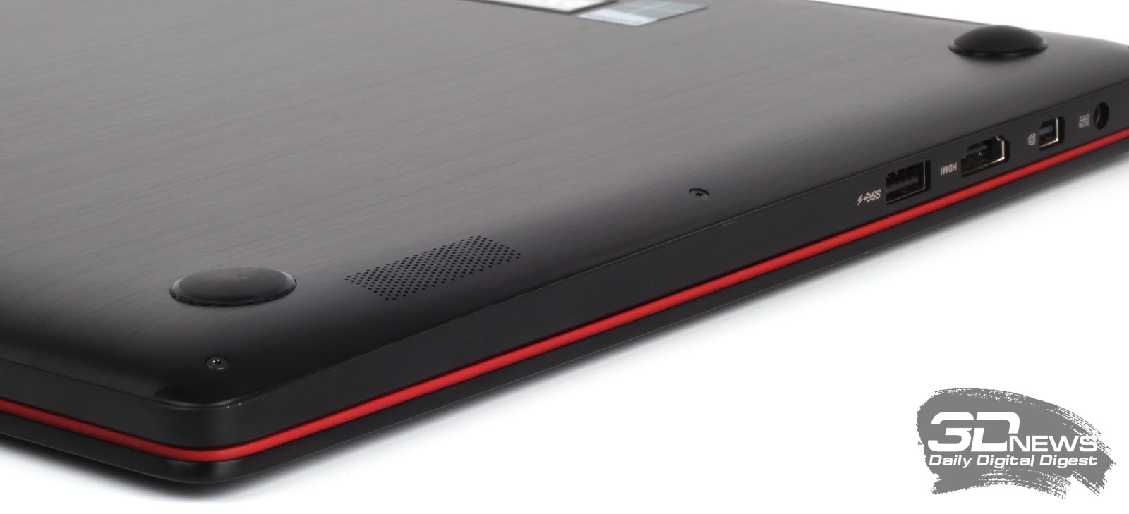 Корпус у ASUS G501JW полностью выполнен из металла, окрашенного в тёмно-серый, почти чёрный цвет и имеющего хорошо заметную на ощупь шероховатость. Толщина корпуса почти везде одинаковая, а сам он выглядит как правильный параллелепипед со слегка сглаженными гранями. Никаких зауженных или заострённых граней, зрительно уменьшающих толщину корпуса, у новинки нет — все грани ровные, без скосов. Опирается ноутбук на четыре крупные резиновые ножки, размещённые на совершенно ровной нижней металлической поверхности. Кроме них, здесь можно заметить перфорированные прямоугольники, за которыми скрываются стереодинамики.