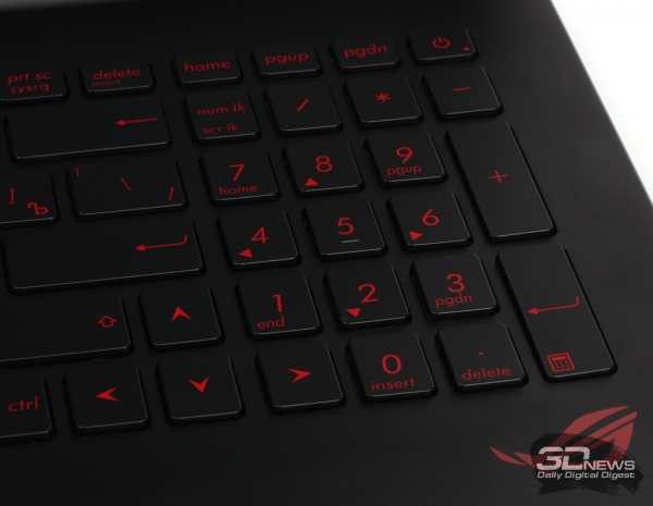 Все основные клавиши имеют стандартные габариты 15 × 15 мм и удалены друг от друга на 3 мм, чего вполне достаточно как для игр, так и для комфортного и быстрого набора текста. Ход у клавиш составляет 1,6 мм. Ощущение комфорта при работе добавляет ещё и чёткая тактильная отдача клавиш. Совмещённых функций у них нет, и за раскладку этой клавиатуре можно было бы поставить твёрдое отлично, если бы не расположение курсорного блока, который буквально втиснут между основным и цифровым блоками. Для игрового ноутбука такое расположение курсорных клавиш может и не самый большой, но всё-таки недостаток. Зато знакомые любому геймеру клавиши [W], [A], [S] и [D] у ASUS G501JW выделены ярко-красным цветом, так что спутать их с соседними буквами будет сложно. Клавиатура имеет регулируемую подсветку красного цвета. Регулировка осуществляется комбинацией клавиш [Fn]+[F3]/[F4] и имеет три уровня яркости. Также нужно отметить, что кнопка управления питанием ноутбука расположена в правом верхнем углу клавиатуру.