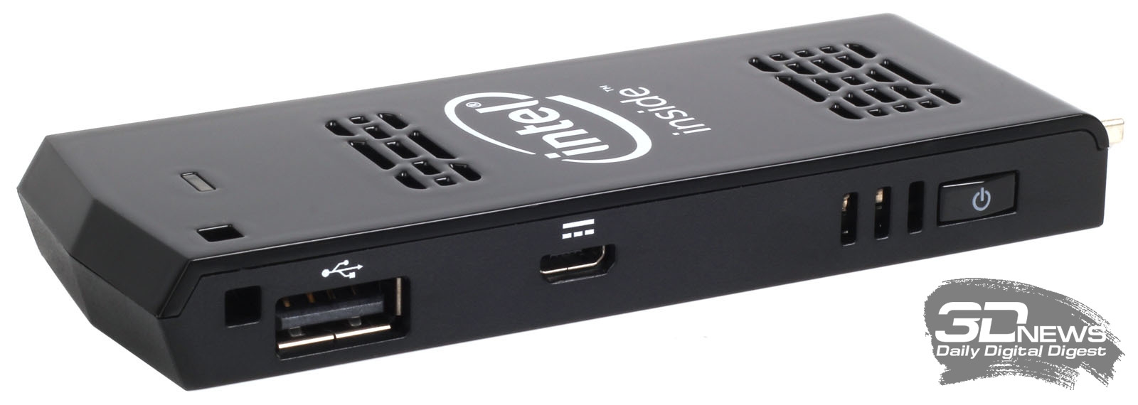 Все остальные интерфейсы Intel Compute Stick размещены на длинных боковых гранях. С одной стороны находятся порты USB 2.0 и Micro-USB, кнопка управления питанием, а также петля для крепления какого-нибудь шнурка или тросика, обеспечивающего сохранность устройства, если видеопанель с ним размещена в публичном месте. С другой стороны корпуса расположен лишь считыватель карт памяти microSDXC. Что касается верхней лакированной панели, то на ней находится светодиодный индикатор питания синего цвета и два больших вентиляционых окна, за одним из которых виден миниатюрный вентилятор. Небольшие вентиляционные отверстия несут на себе и боковые грани.