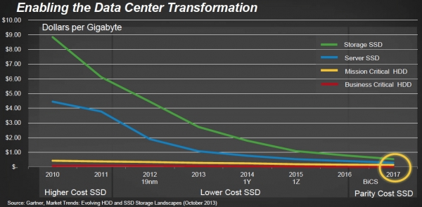 6-Тбайт и 8-Тбайт SSD будут продолжать использовать MLC NAND, но будущие накопители SanDisk для сверхмасштабируемых ЦОД перейдут на многослойную флеш-память типа BiCS, которая обеспечивает большую ёмкость, производительность и надёжность. Согласно ожиданиям SanDisk и Toshiba, трёхмерная NAND-память поможет снизить стоимость SSD в пересчёте на гигабайт хранимых данных до уровня, сравнимого с жёсткими дисками корпоративного класса уже в 2017–2018 годах.
