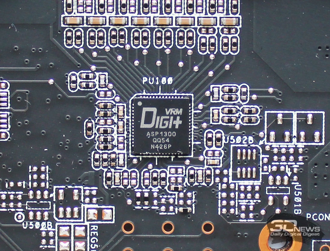 Управление питанием графического процессора осуществляется контроллером Digi+ ASP1300 производства International Rectifier.