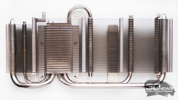Радиатор базируется на пяти медных тепловых трубках. Две из них имеют диаметр 10 мм, ещё две – 8 мм и одна крайняя – 6 мм. При этом по основанию кулера, выполненному по технологии прямого контакта, очевидно, что в теплообмене с кристаллом графического процессора участвую только три трубки из пяти, из которых две — не более чем наполовину.