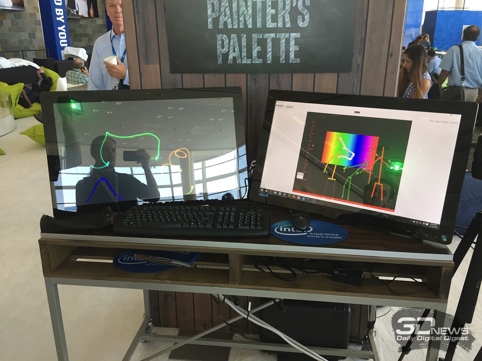 В выставочном зале IDF можно было увидеть несколько проектов на основе RealSense. Самые простые демонстрации сводятся к тому, что компьютер формирует трехмерные воксельные модели людей, которые проходят напротив камеры, и выводит их на экран в реальном времени.