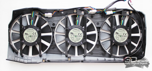 Скорость вращения всех трёх «вертушек» с дополнительным торцевым «плавником», увеличивающим на 20% воздушный поток, изменяется автоматически ШИМ-методом в диапазоне от 0 до 3680 об/мин. До достижения графическим процессором температуры 60 градусов Цельсия вентиляторы вообще не вращаются, делая ASUS STRIX GTX 980 Ti абсолютно бесшумной видеокартой. Причём слово «абсолютно» здесь не является преувеличением, поскольку пресловутого писка дросселей, которым грешат некоторые производители топовых видеокарт, у данного экземпляра нет.
