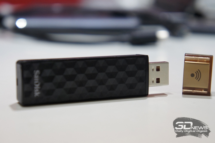 На стенде SanDisk можно увидеть флеш-брелоки iXpand вместимостью до 128 Гбайт. Они наделены двумя коннекторами — Lightning и USB. Это позволяет без особых усилий переносить файлы с портативного iOS-гаджета на персональный компьютер (на базе Mac OS X или Windows) и наоборот.