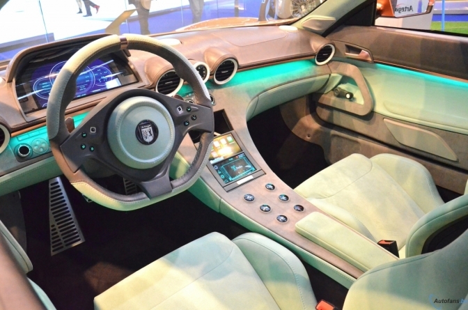 Интерьер Artega Scalo довольно трудно назвать изысканным, хотя в современных примочках ему не откажешь: тут есть и полностью цифровой щиток приборов, и 13 динамиков аудиосистемы, и беспроводная зарядка для смартфона. Кстати, через колонки можно запустить синтетический звук двигателя. При этом автомобиль будет испускать его еще и снаружи: так прохожие смогут подумать, что под капотом прячется какой-нибудь V6 или даже V8.