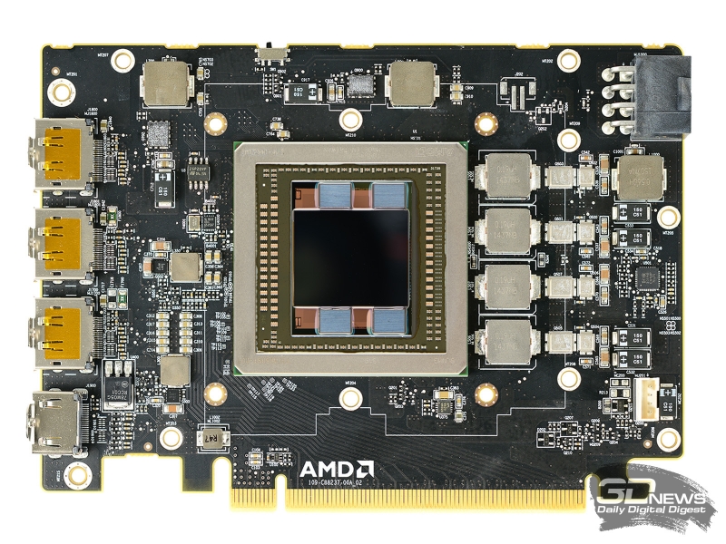 Но есть и еще один немаловажный эффект: так как все линии шины памяти проходят в подложке, GPU вместе с чипами RAM занимает скромную площадь на печатной плате ускорителя. В обзорах Radeon R9 Fury и Fury X вы уже видели весьма компактную референсную PCB, которая особенно контрастирует с массивным радиатором охлаждения R9 Fury. Если бы не стояла задача отвести от GPU 275 Вт тепла, то на основе Fiji можно было бы создать чрезвычайно быструю видеокарту, подходящую даже для компьютеров форм-фактора Micro-ITX. И вот она перед нами!