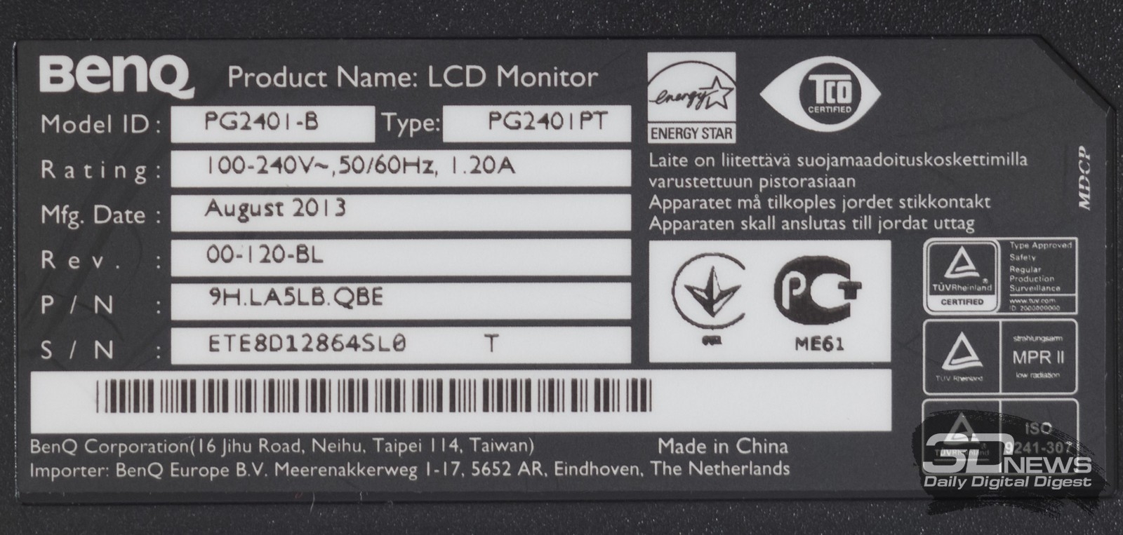 По наклейке на корпусе устройства можно сверить все номера (серийный, номер партии и так далее), дату, место производства и узнать версию экземпляра (00-120-BL). Что до реального производителя, то можно смело говорить: им является основной подрядчик BenQ в вопросе мониторов – небезызвестная компаний Qisda.