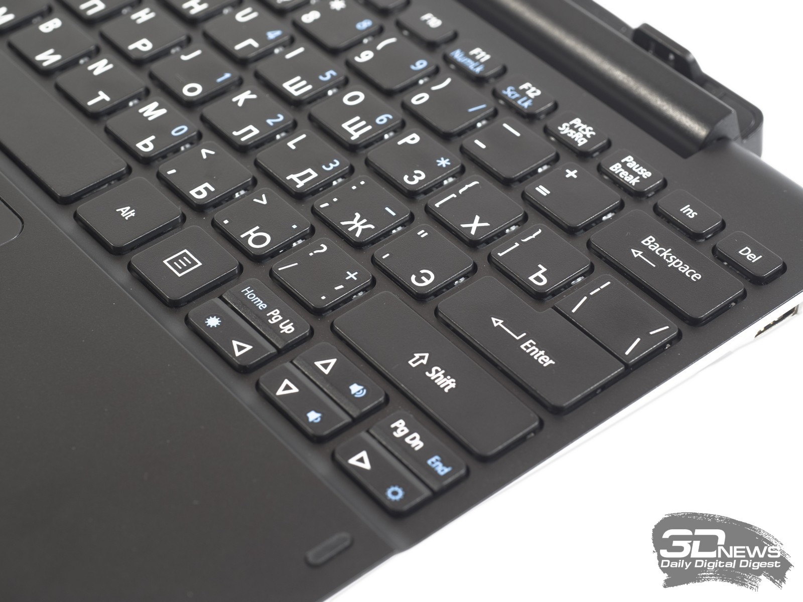 Все основные клавиши островного типа имеют габариты 14 × 15 мм и удалены друг от друга на 3,5 мм. Схожими размерами обладают многие полноценные ноутбуки, а поэтому больших проблем с набором текста возникнуть не должно. Хотя лично автору этой статьи печать на Switch 10e давалась нелегко, и количество нажатий «не туда» постоянно огорчало.
