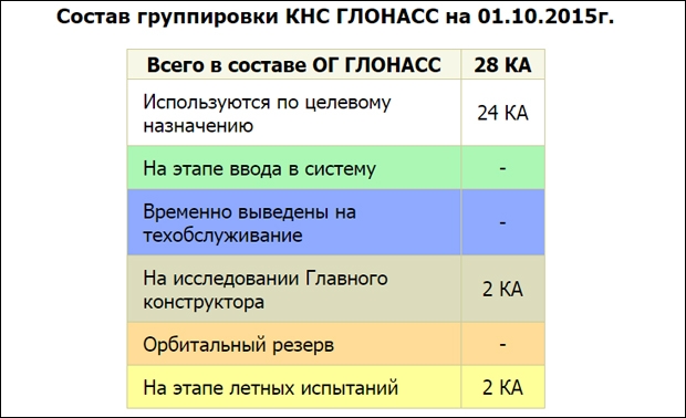 В настоящее время орбитальная группировка ГЛОНАСС состоит из 28 космических аппаратов. Из них 24 используются по целевому назначению. Ещё по два спутника находятся на этапе лётных испытаний и на исследовании главного конструктора.