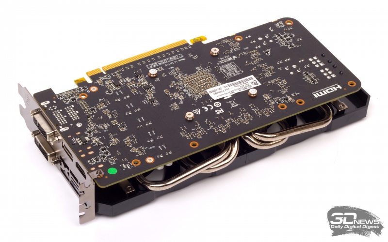 Система охлаждения адаптера включает радиатор с медным основанием и четыре тепловые трубки небольшого диаметра. Поток воздуха создают два вентилятора типоразмера 80 мм.