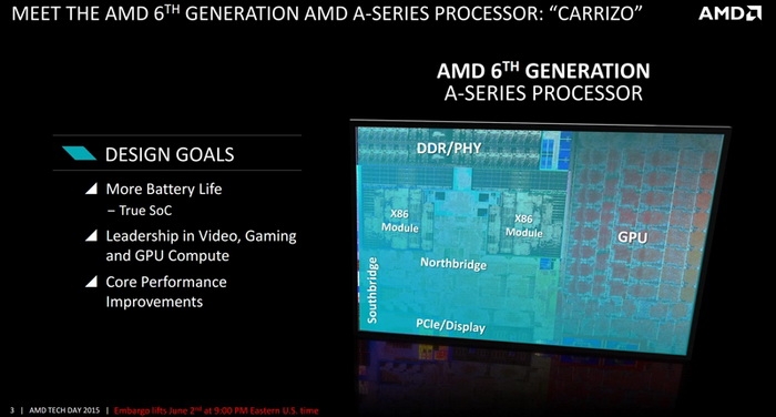 Базовую частоту удалось найти в спецификациях нового ноутбука HP Pavilion 15-ab103nt, согласно им, этот показатель равен 2 ГГц. Объём кеша L2 не изменился и по-прежнему составляет по мегабайту на модуль, в сумме 2 Мбайт. Графическое ядро содержит 8 модулей GCN, что эквивалентно 512 шейдерным процессорам. Как и все Carrizo, чип производится с использованием 28-нм техпроцесса GlobalFoundries.