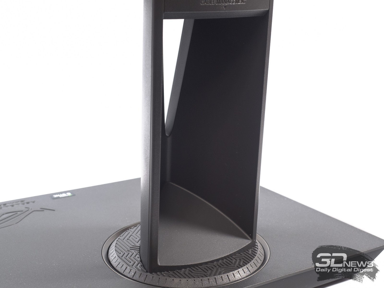 В мониторе используется качественный темно-серый матовый пластик с различной фактурой (в зависимости от элемента). Скошенные грани фигурной и слегка наклонённой подставки на этот раз плоские, без рисунка. К устойчивости опоры не придраться.