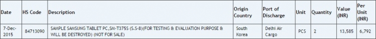 Два экземпляра планшета Samsung SM-T375S поступили в страну 7 декабря для тестирования и оценки. В декларации указана стоимость модели SM-T375S — $103. Хотя это и не окончательная цена планшета, тем не менее, уже есть ясность, что мы имеем дело с устройством нижнего ценового уровня. Также в документе сообщается, что после прохождения тестов Samsung SM-T375S будет разрушен.