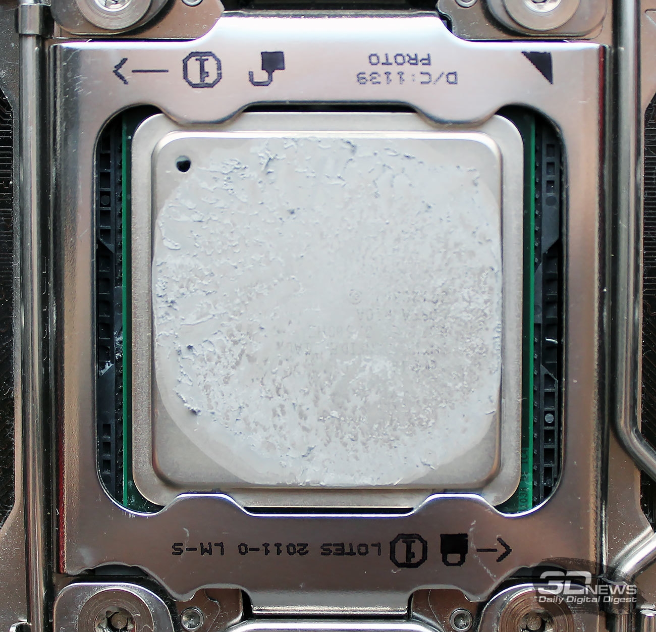 Хотя поверхность теплораспределителя используемого нами процессора немного выпуклая, отпечатки мы получили довольно неплохие. Однако нельзя не отметить  избыток термопасты.