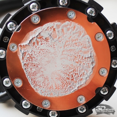 О водоблоке также известно совсем немного. Он медный, микроканальный, с расстоянием между рёбрами 0,2 мм и высотой 5 мм. На его основание уже нанесён термоинтерфейс серого цвета с неизвестными характеристиками.