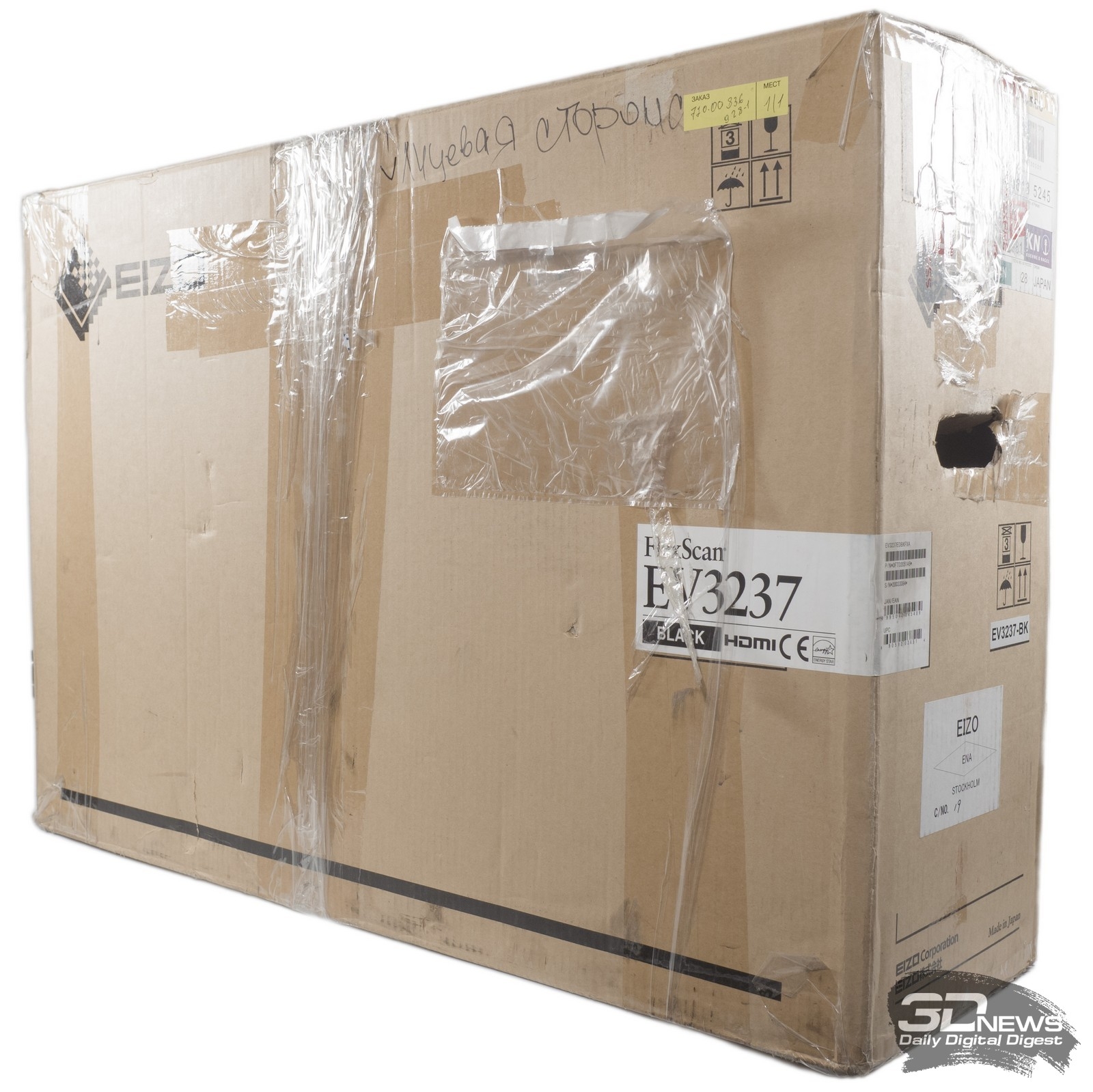 Монитор EIZO EV3237 поставляется в простой картонной коробке внушительных размеров в полностью собранном состоянии. Ни фотографий, ни какой-либо информации о технических преимуществах этой модели на ее упаковке нет. Для удобства транспортировки можно воспользоваться двумя специальными вырезами на торцах.