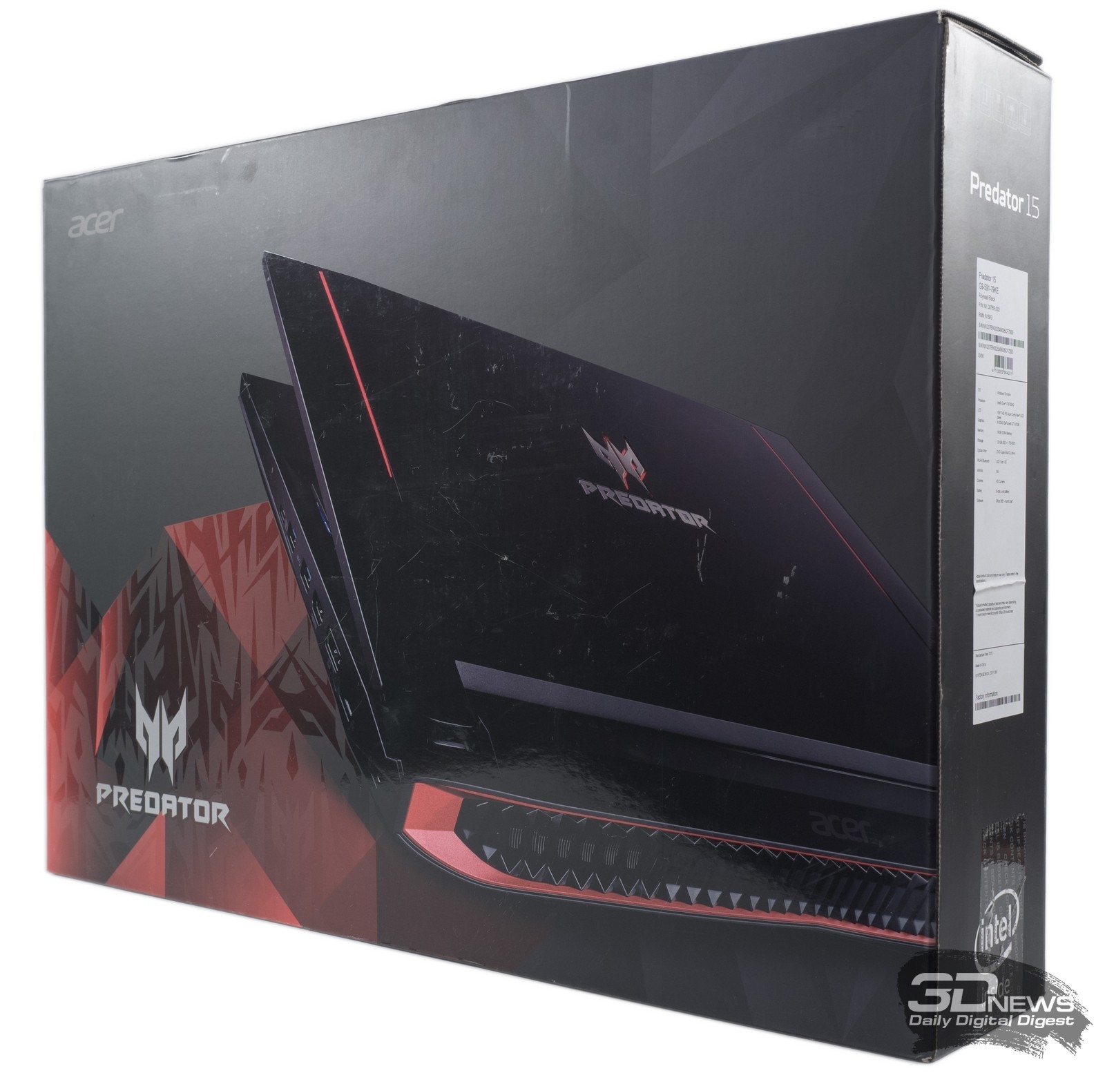 Ноутбук Predator 15 упакован по принципу «дополнительная защита лишней не будет». Основная чёрная коробка с устройством находится внутри плотной картонной упаковки с нанесённым логотипом компании, перечислением основных особенностей модели и парой фотографий. Внутри также находятся две дополнительные секции для элементов комплекта поставки. Для удобства переноски есть пластиковая ручка сверху.