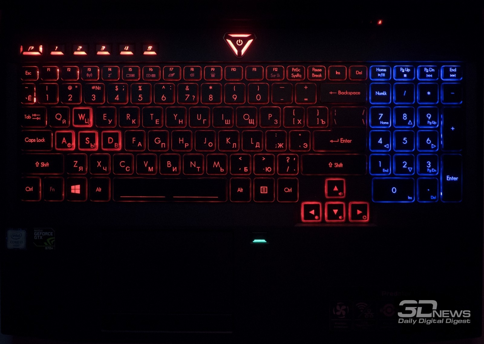 Инженеры Acer сумели разместить в своём 15,6-дюймовом Predator 15 полноразмерную клавиатуру островного типа с цифровым блоком. Удалось даже обойтись без сокращения ширины крайних клавиш, они остались стандартного размера 15 × 15 мм. А вот высота верхних управляющих кнопок была немного уменьшена.