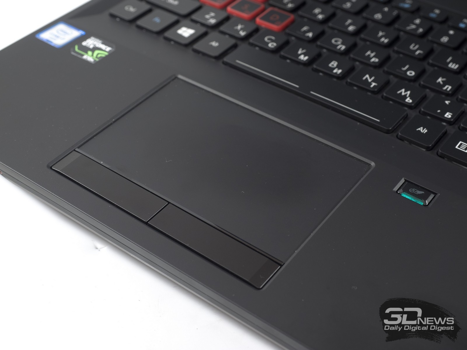 Рабочая область сенсорной панели среднего размера — 106 × 65 мм — и смещена влево от центра. Она обладает полуматовой пластиковой поверхностью. Предусмотрены две физические клавиши с мягким ходом, тихим звуком нажатия и хорошей тактильной отдачей. Тачпад отличается высокой чувствительностью и адекватностью работы при использовании жестов. Рядом находится клавиша дезактивации тачпада – на случай если вы пользуется отдельной геймерской мышкой.