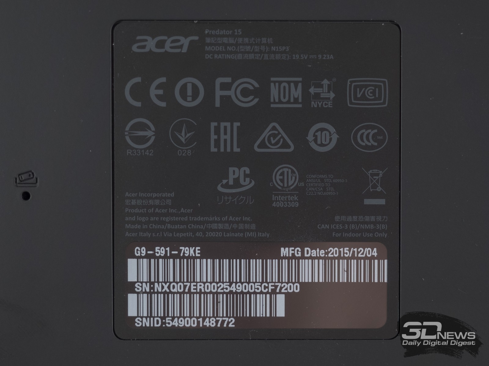 По наклейке в нижней части корпуса покупатель может узнать более точную дату изготовления. Наш экземпляр Predator 15 был изготовлен 4 декабря 2015 года в Китае.