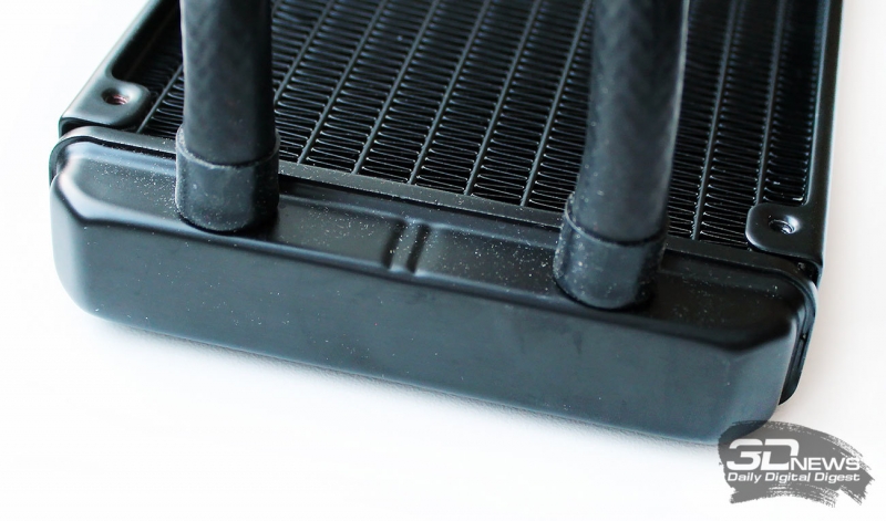 Между каналами приклеена перфорированная гофролента с межрёберным расстоянием от одного до двух миллиметров. С обеих сторон радиатора есть отверстия с резьбой для установки 120-мм вентиляторов.