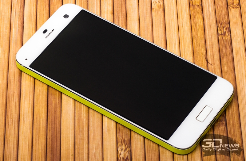 В верхней части лицевой панели находится прорезь разговорного динамика, а также глазок фронтальной камеры и крохотная диодная вспышка. Рядом с объективом расположился довольно крупный светодиодный индикатор, сообщающий о пропущенных событиях. Под дисплеем – прямоугольная клавиша «Домой», а также сенсорные кнопки «Назад» и «Меню», оснащенные подсветкой. Ход у единственной аппаратной клавиши на лицевой панели довольно длинный, на любителя. Лицевая панель прикрыта листом закаленного стекла с олеофобным покрытием Corning Gorilla Glass 3 — оно устойчиво к появлению царапин и легко очищается от «пальчиков».